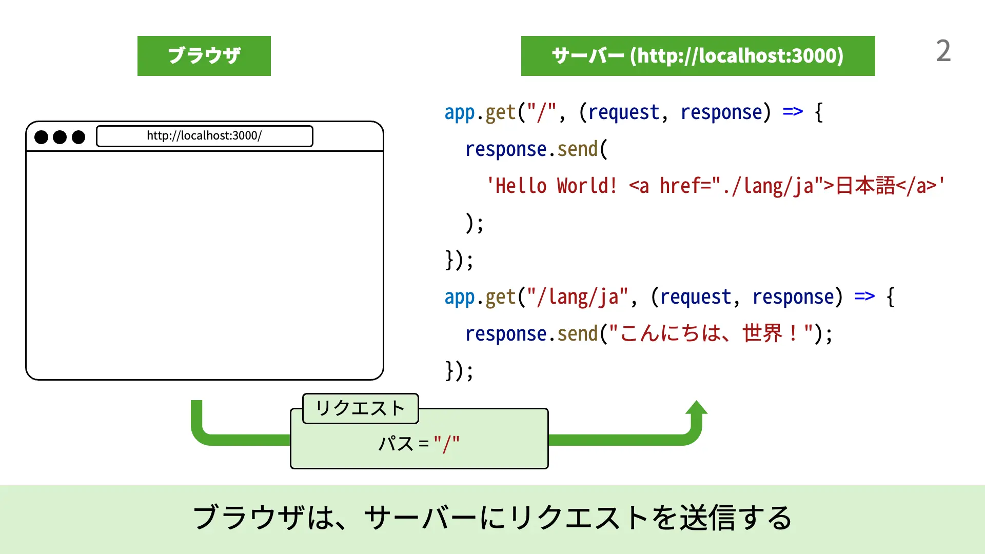 2. ブラウザは、localhost:3000で起動しているExpressのサーバーに対して、/というパスに対するHTTPリクエストを送信します。