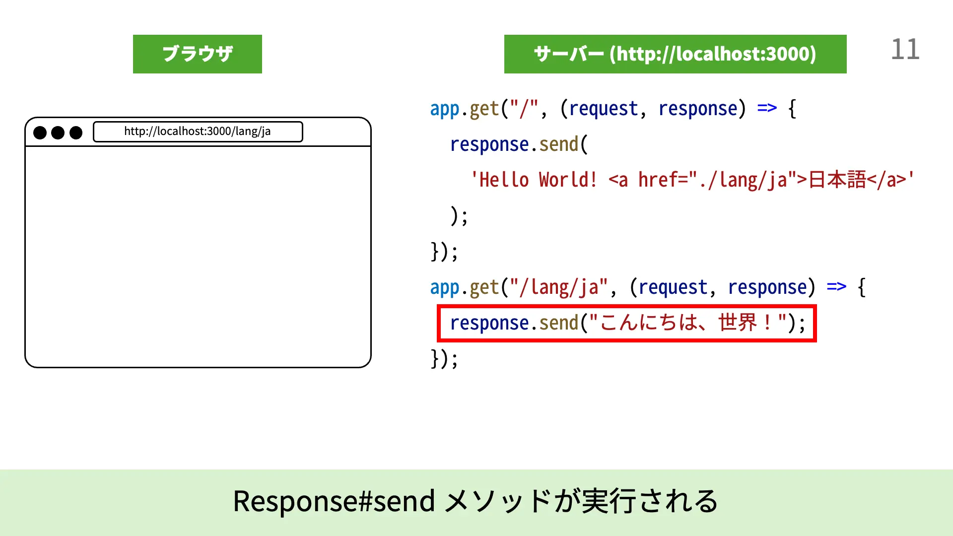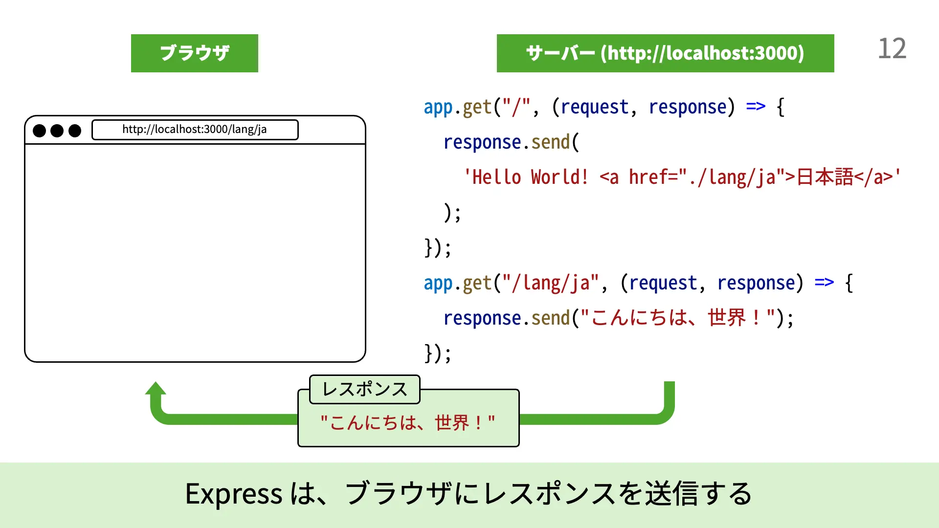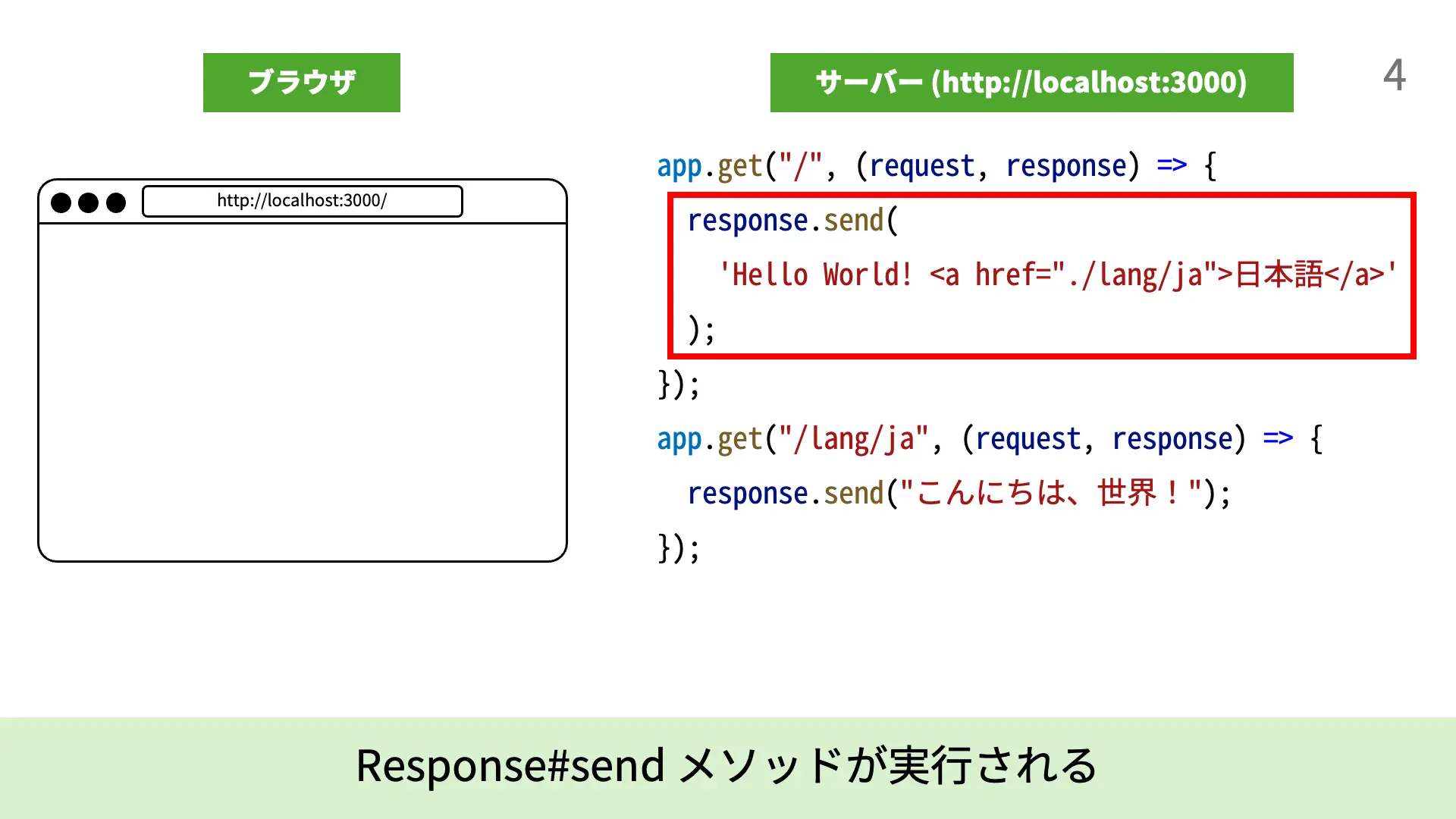 4. [5行目]response.send(`...`);により、Expressは`Hello World! <a href="./lang/ja">日本語</a>`という文字列をレスポンスとして送信します。